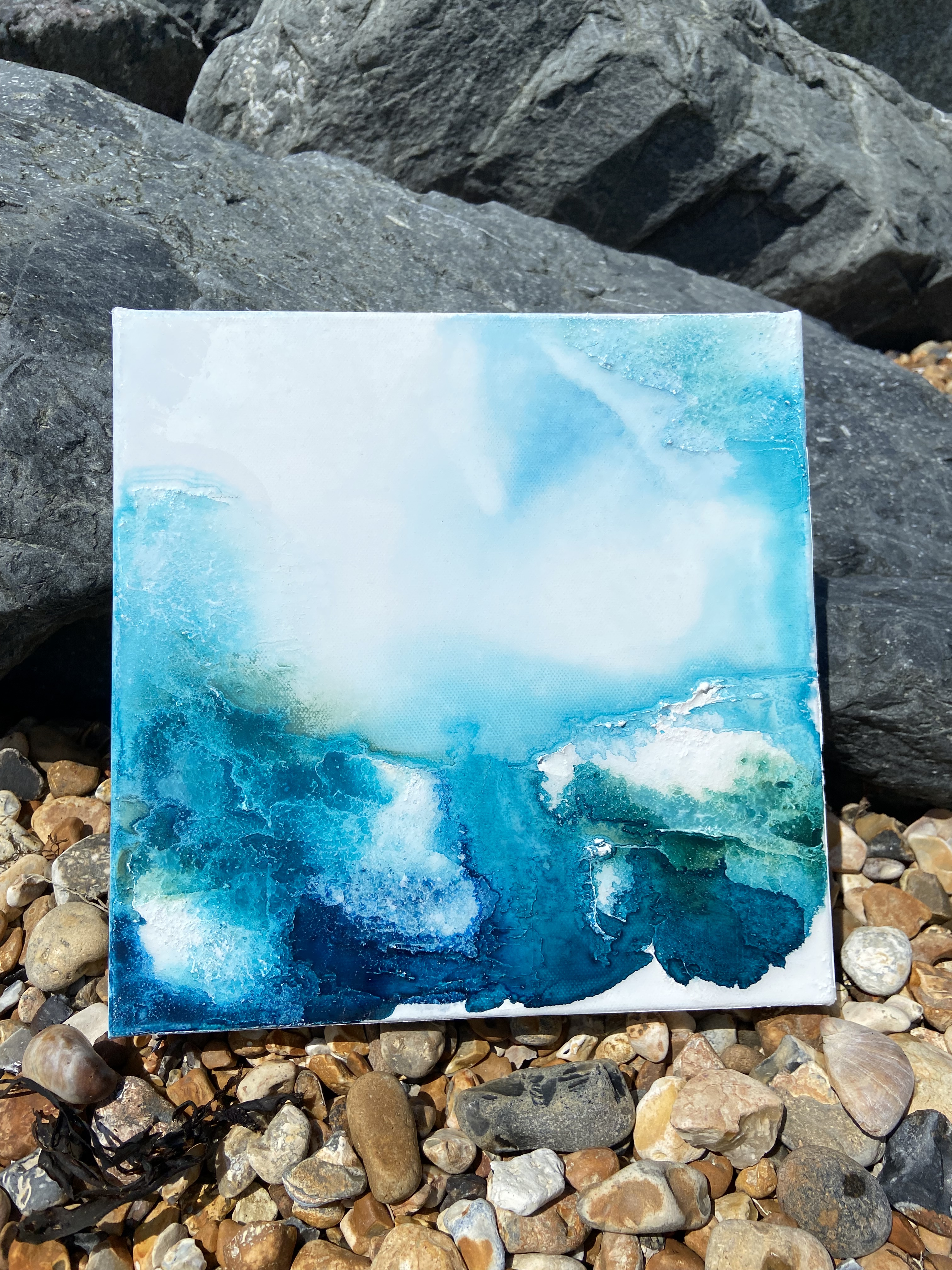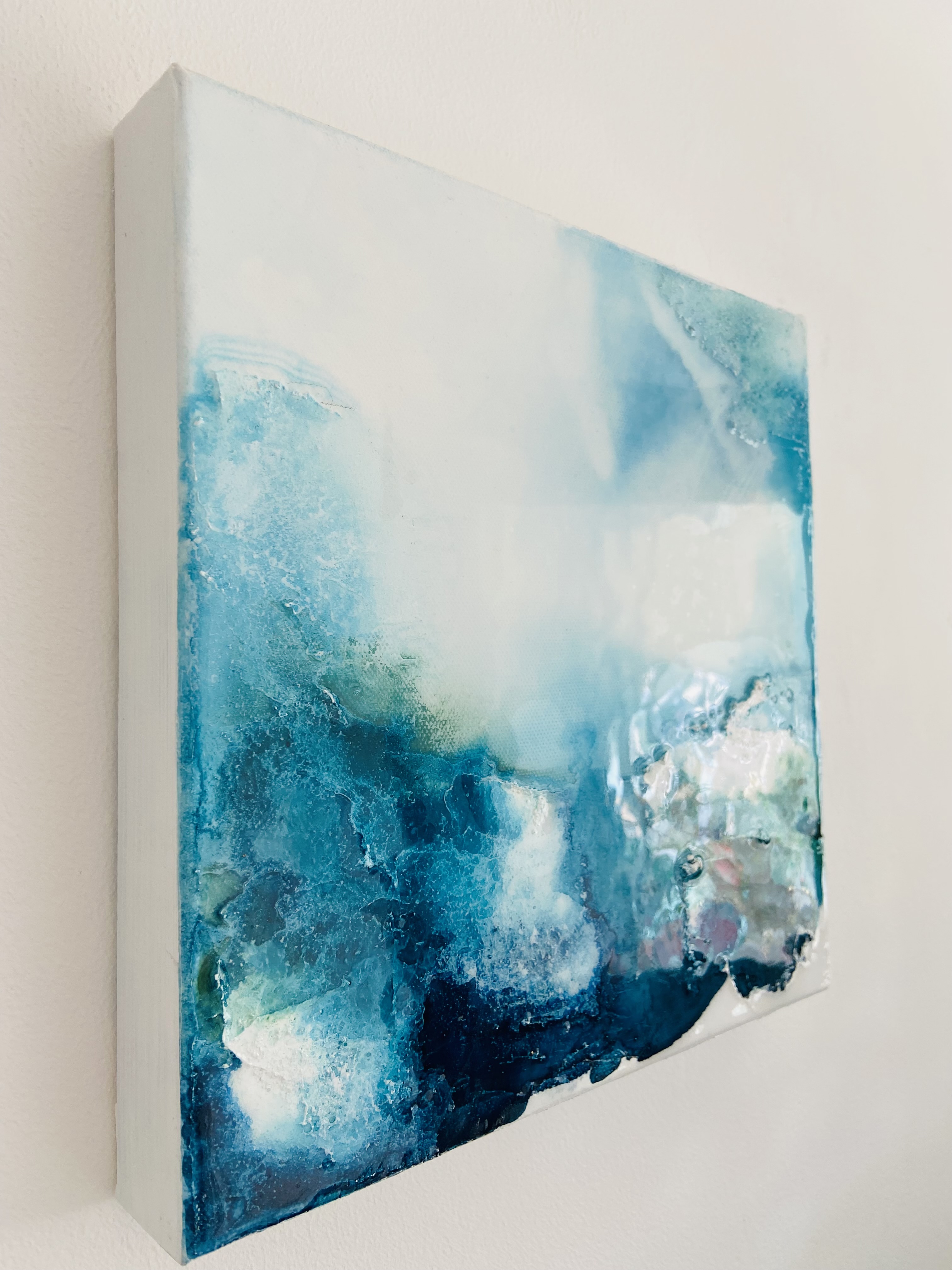Liquid acrylic and mixed media texture with a shiny resin coating which highlights the colour and adds an extra reflective dimension.